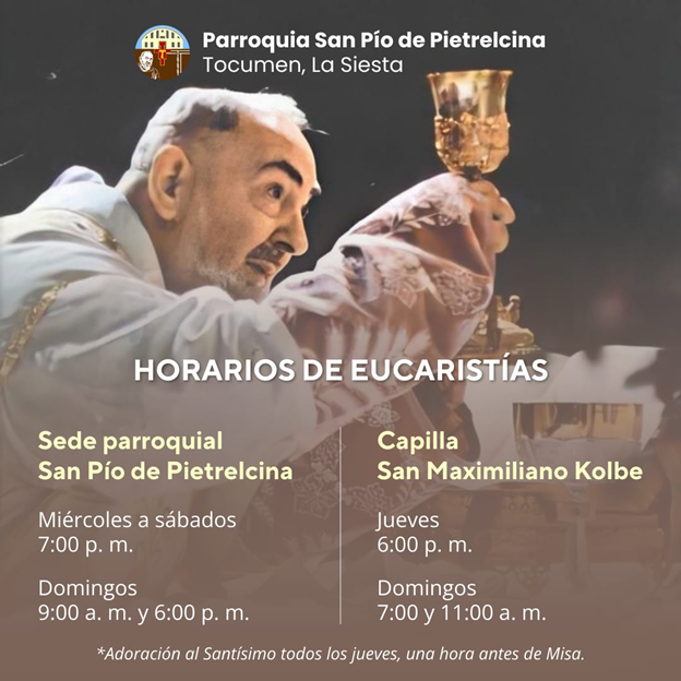 La Santa Misa es el centro de nuestra vida parroquial y la fuente de toda gracia. Te invitamos a participar en la celebración de la Eucaristía en nuestra Parroquia San Pío de Pietrelcina.
